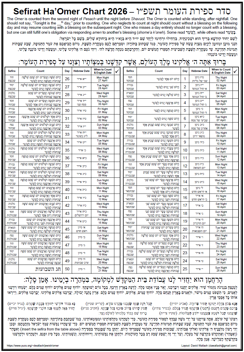 This year the Omer chart is available in four versions. Depending on your device, you may need to scroll down/across to see them all. Click on the image to download the PDF.